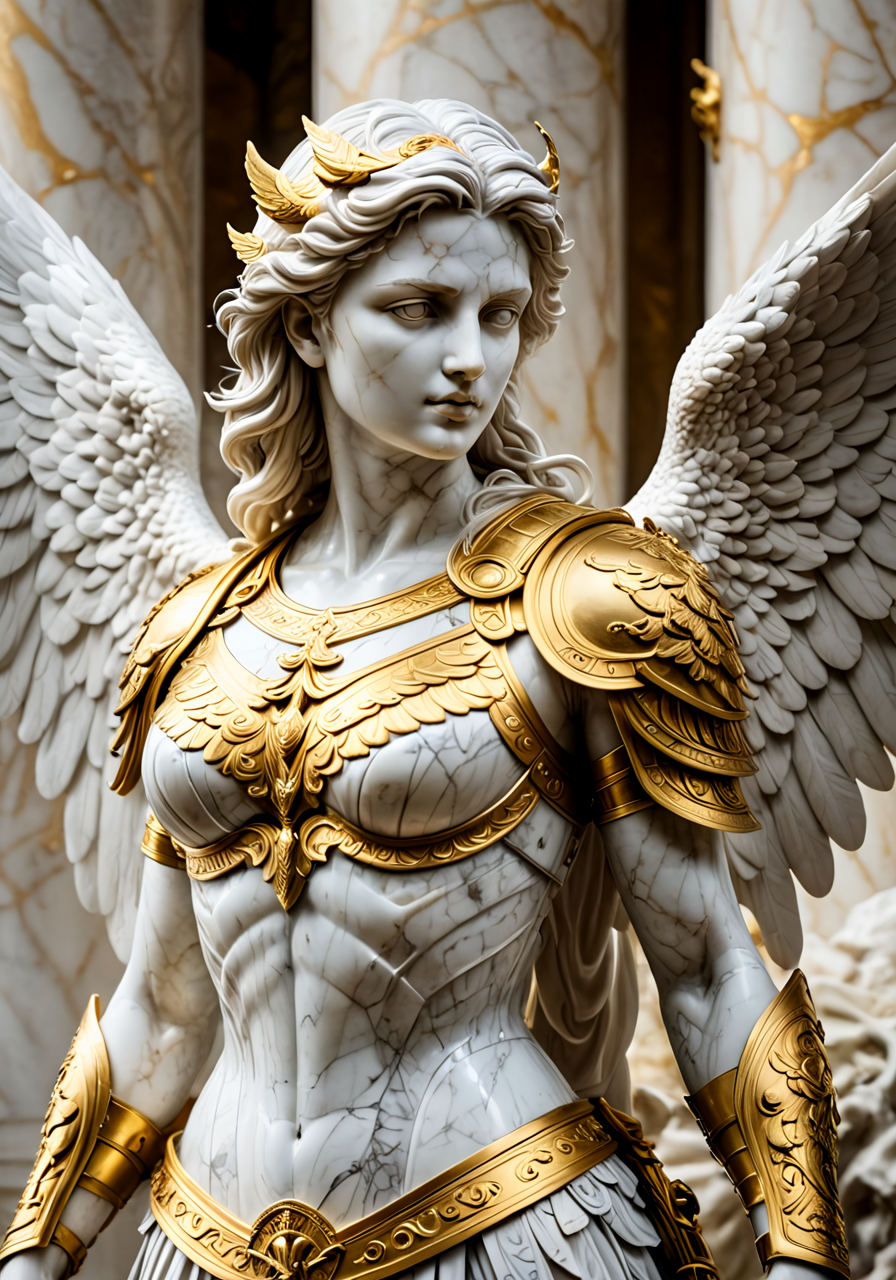masterpiece, extremely detailed, sharp outlines, high contrast, fine details, intricate, photo of a white marble sculpture of a female armored angel, full armor, breastplate white and gold trim, intricate background, bokeh, beautiful landscape, inspiring, neoclassical art style, , , cstatuesdxl<lora:add-detail-xl.safetensors:0.6:0.6> <lora:challenge\SDLX1\cstatuesdxl.safetensors:1.0:1.0>