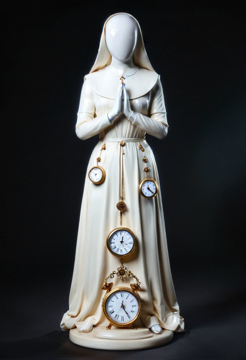 8K analog photo, fullbody, from front, faceless, statue of a nun made of Clock_Style, prays, dark background,