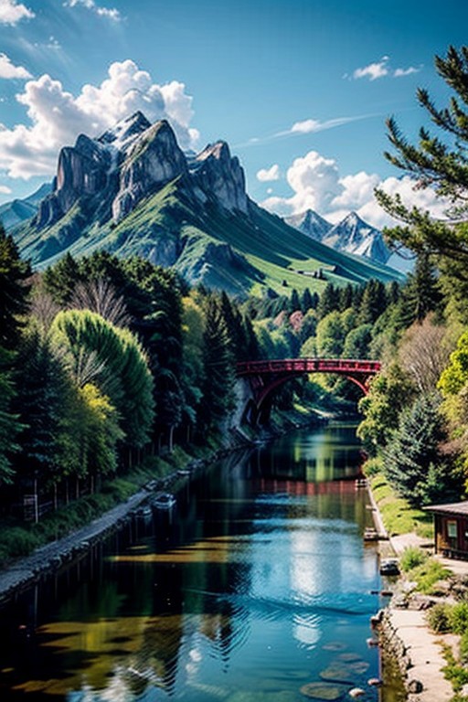 masterpiece, best quality, amazing quality ,A stunning landscape photograph from a bird's eye view, featuring a picturesque village situated on the banks of a river surrounded by lush green mountains and a waterfall in the background. the village is made up of small, red-tiled buildings with pointed roofs, and a winding wooden bridge crosses over the river. the river is calm and clear, with a few small boats visible on its surface. the sky is bright blue with fluffy white clouds scattered across it, and the sun is shining brightly, casting a warm glow on the scene. the mountains are tall and imposing, with jagged peaks and a serene landscape. the scene is peaceful and picturesque, with the village taking up most of the frame. the overall atmosphere is one of tranquility and serenity. outdoors, sky, day, cloud, water, blue sky, tree, bird, scenery, architecture, mountain, river, scenery,32k, UHD, ultra detailed, vivid colors, high quality, sharp focus
