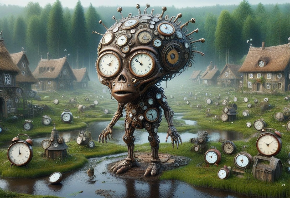 score_9, score_8_up, score_7_up, masterpiece, best quality, made of clock, A cool-headed alien in a beautiful village in a bog, midday