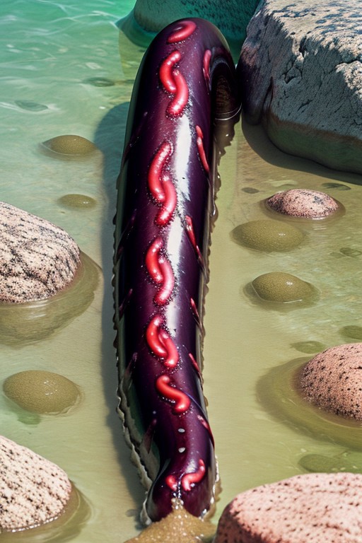 very realistic photo, hdr, of a 10-foot long massive very thick very muscular dark crimson glossy eel, very swollen, stands straight up from the sand at the bottom of the deep ocean surrounded by rocks, it has a mouth like a lamprey and a milky slime is squirting out of the mouth, turgid and engorged and it has a long pink tongues, smooth skin, dog knot at the base