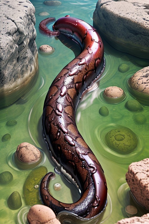 very realistic photo, hdr, of a 10-foot long massive very thick very muscular dark crimson glossy eel, very swollen, stands straight up from the sand at the bottom of the deep ocean surrounded by rocks, it has a mouth like a lamprey and a milky slime is squirting out of the mouth, turgid and engorged and it has a long pink tongues, smooth skin, dog knot at the base