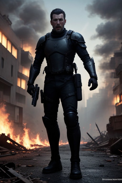 1male in gray hair, slicked back, gray beard, scarred face, red cyberoptic, robot arm, bullet proof vest, knee armor, shoulder armor, combat pants, tactical boots, tactical glove, angry, yelling, warzone, destroyed city, burning building, destroyed cars, soldiers behind