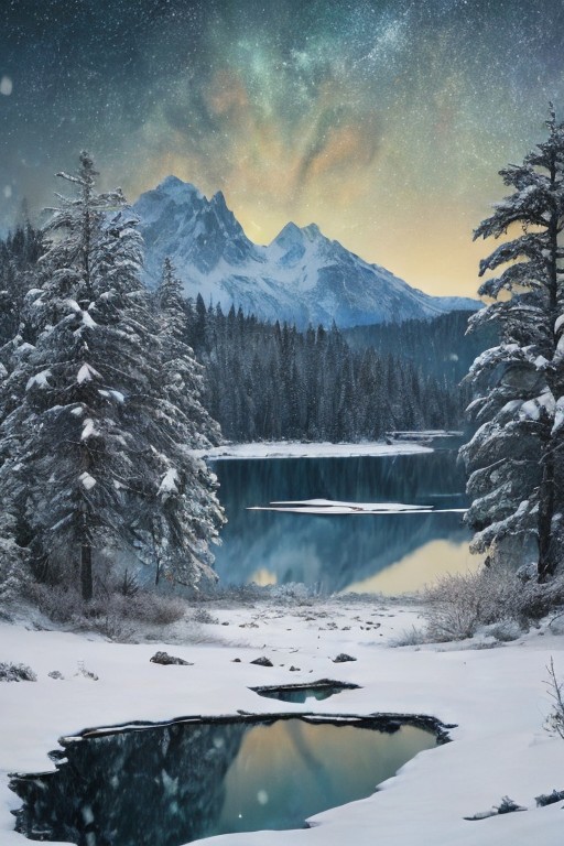 Masterpiece, high-resolution, grainy image, tall mountains, pine forest, lake, snow, galaxy