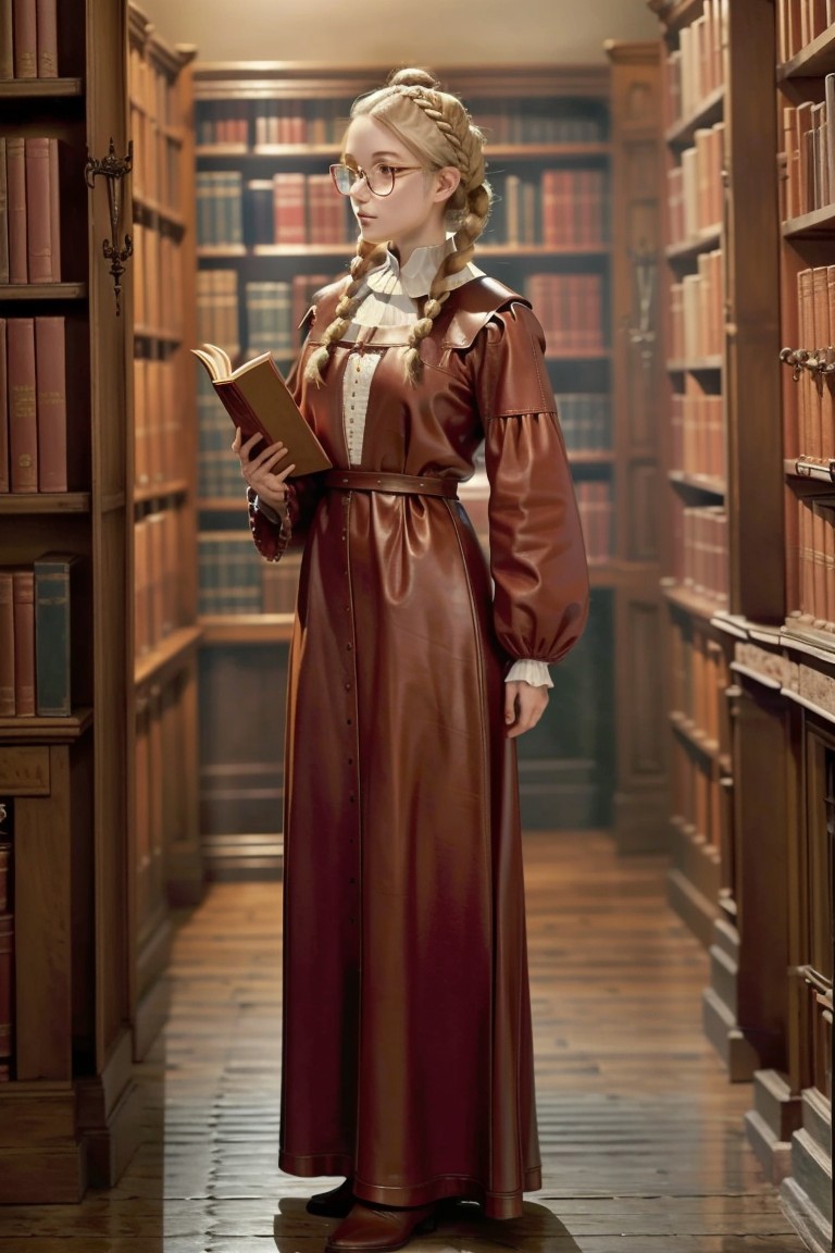score_9, score_8_up, Masterpiece, side profile view, Full body portrait, A blonde woman wearing a simple but elegant red medieval dress and brown leather boots, standing in a medieval library, holding an open book, wearing metal half-frame glasses, hair side braids, hair tight bun, dark background, candle light