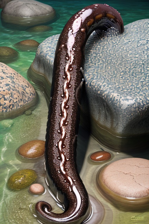 very realistic photo, hdr, of a 10-foot long massive very thick very muscular dark pnk glossy eel, very swollen, stands straight up from the sand at the bottom of the deep ocean surrounded by rocks, it has a mouth like a lamprey and a milky slime is squirting out of the mouth, turgid and engorged and it has a long pink tongues, smooth skin