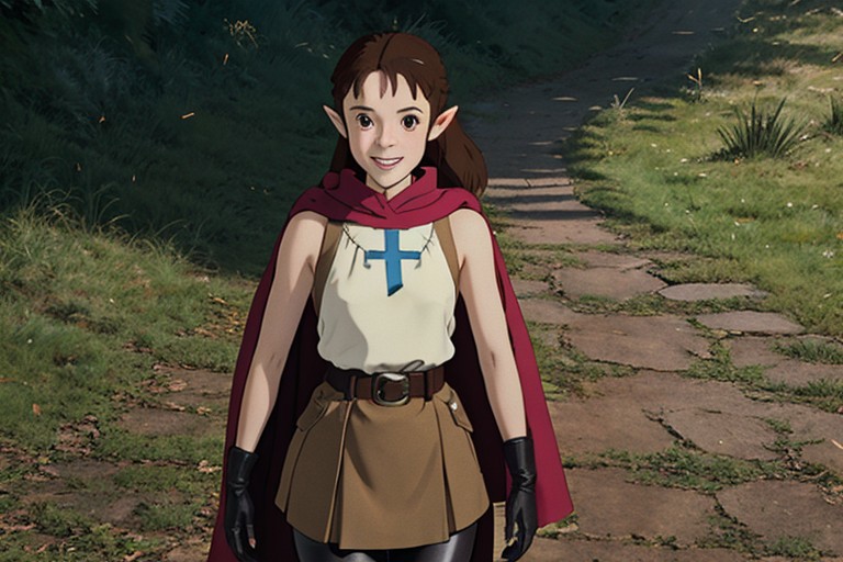 ghibli style, asuna \(sao\), 1girl, arms behind back, bare shoulders, blush, brown eyes, brown hair, long hair, looking at viewer, sleeveless, smile, solo, upper body has golden-brown eyes and long, brown ponytail hair with a pair of feathers atop her head. She dresses in a brown cloak secured with a ribbon. Mumei also wears gloves that are fingerless on her index and pinky fingers. She has a belt wrapped around her waist with a lantern, pouch, and small dagger around it. Below her outfit is a pleated skirt. She has leggings with her right leg reaching above her thighs and the left leg below her thighs, and wears brown boots. Friend flying beside her is a paper bag with a drawn mouth and a plaster shaped like a cross on his face. , ((masterpiece)) <lora:ghibli_style_offset:1.07> <lora:princess_zelda:0.4>