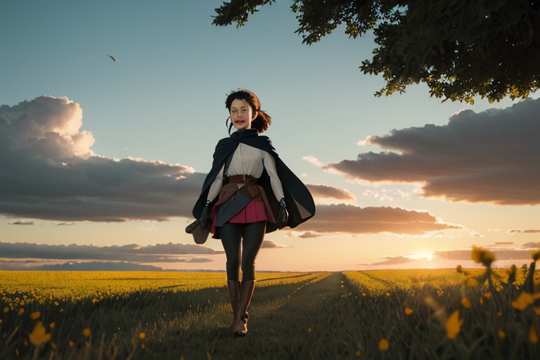 ghibli style, has golden-brown eyes and long, brown ponytail hair with a pair of feathers atop her head. She dresses in a brown cloak secured with a ribbon. Mumei also wears gloves that are fingerless on her index and pinky fingers. She has a belt wrapped around her waist with a lantern, pouch, and small dagger around it. Below her outfit is a pleated skirt. She has leggings with her right leg reaching above her thighs and the left leg below her thighs, and wears brown boots. Friend flying beside her is a paper bag with a drawn mouth and a plaster shaped like a cross on his face. walks calmly towards a distant sunset across a vast golden field. Her silhouette casts long shadows on the swaying grass as warm amber light bathes the landscape. The camera maintains a stationary wide shot, capturing the serene atmosphere with shallow depth of field, emphasizing the harmony between the solitary figure and nature’s grand spectacle. , ((masterpiece)) <lora:ghibli_style_offset:1.07> <lora:princess_zelda:0.4>