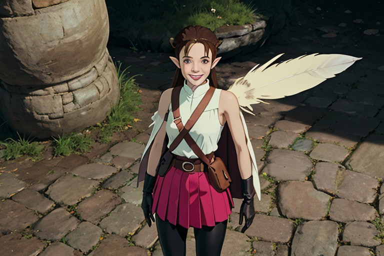 ghibli style, asuna \(sao\), 1girl, arms behind back, bare shoulders, blush, brown eyes, brown hair, long hair, looking at viewer, sleeveless, smile, solo, upper body has golden-brown eyes and long, brown ponytail hair with a pair of feathers atop her head. She dresses in a brown cloak secured with a ribbon. Mumei also wears gloves that are fingerless on her index and pinky fingers. She has a belt wrapped around her waist with a lantern, pouch, and small dagger around it. Below her outfit is a pleated skirt. She has leggings with her right leg reaching above her thighs and the left leg below her thighs, and wears brown boots. Friend flying beside her is a paper bag with a drawn mouth and a plaster shaped like a cross on his face. , ((masterpiece)) <lora:ghibli_style_offset:1.07> <lora:princess_zelda:0.4>
