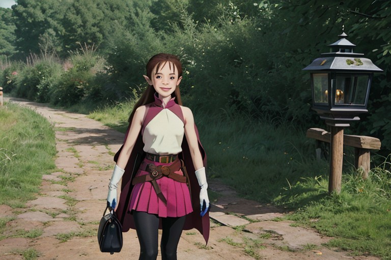 ghibli style, asuna \(sao\), 1girl, arms behind back, bare shoulders, blush, brown eyes, brown hair, long hair, looking at viewer, sleeveless, smile, solo, upper body has golden-brown eyes and long, brown ponytail hair with a pair of feathers atop her head. She dresses in a brown cloak secured with a ribbon. Mumei also wears gloves that are fingerless on her index and pinky fingers. She has a belt wrapped around her waist with a lantern, pouch, and small dagger around it. Below her outfit is a pleated skirt. She has leggings with her right leg reaching above her thighs and the left leg below her thighs, and wears brown boots. Friend flying beside her is a paper bag with a drawn mouth and a plaster shaped like a cross on his face. , ((masterpiece)) <lora:ghibli_style_offset:1.07> <lora:princess_zelda:0.4>