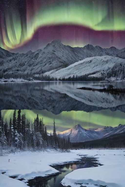 Masterpiece, high-resolution, grainy image, tall mountains, pine forest, lake, snow, galaxy, aurora Borealis