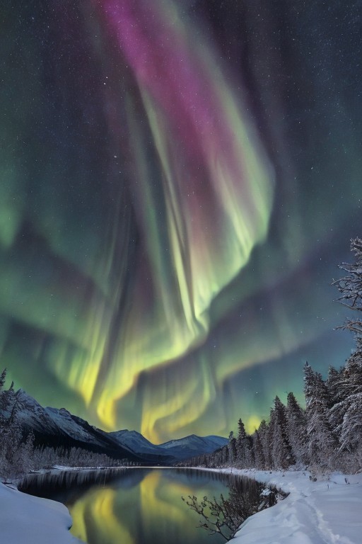 Masterpiece, high-resolution, grainy image, tall mountains, pine forest, lake, snow, galaxy, aurora Borealis