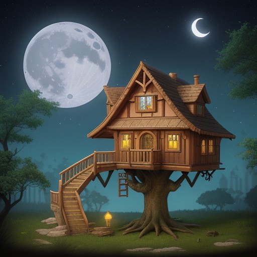 a close-up photo of the Isometric_Dreams, a tree house with a tower and a staircase inside of it, surrounded by trees and a moon in the sky