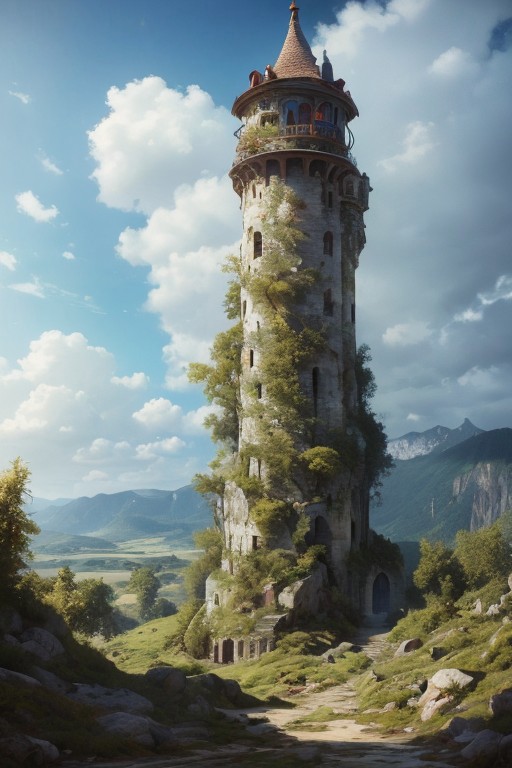 realistic analog photo, award winning photo, vary wide shot of magic stone witow tower:1.3, (Military watchtower), scenery, fantasy, peak, dirt road, nature, outdoors, RAW, highres, 8k, uhd, High Dynamic Range, tonemapping, crisp details,