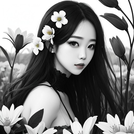 (ttatt:1.1), a girl with half face on flowers, dark style, bw, chrome, masterpiece, dynamic forms