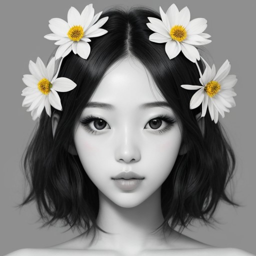 (ttatt:1.1), a girl with half face on flowers, dark style, bw, chrome, masterpiece, dynamic forms