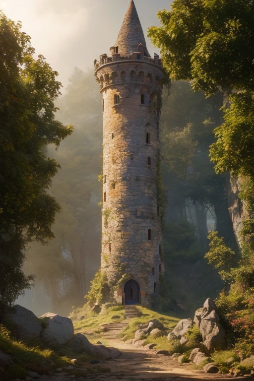 realistic analog photo, award winning photo, vary wide shot of magic stone witow tower:1.3, (Military watchtower), scenery, fantasy, peak, dirt road, nature, outdoors, RAW, highres, 8k, uhd, High Dynamic Range, tonemapping, crisp details,