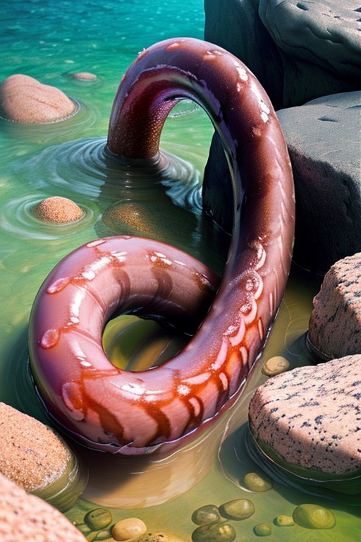 very realistic photo, hdr, of a 10-foot long massive very thick very muscular dark pink glossy eel, very swollen, stands straight up from the sand at the bottom of the deep ocean surrounded by rocks, it has a mouth like a lamprey and a milky slime squirts out of the mouth, long pink tongues, smooth skin