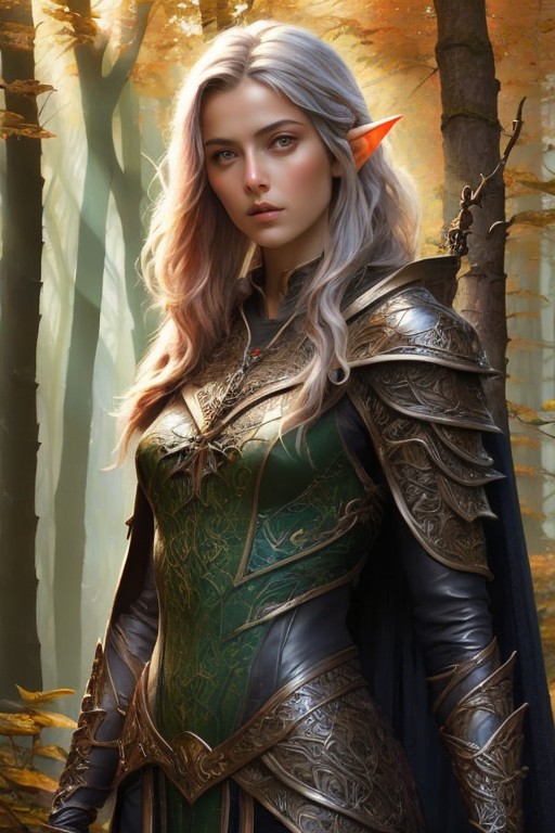 RAW photo, (masterpiece:1.3), subsurface scattering, heavy shadow, (high quality:1.4), (intricate, high detail:1.2), professional photography, HDR, High Dynamic Range, realistic, ultra realistic, photorealistic, high resolution, film photography, ambient lighting, atmospheric effects, <lora:detail_slider_v4:2>, OverallDetail, 80sdarkfantasysd15b, a female elven ranger wearing intricate leather armor, cape,<lora:ElvenArmor1:0.7>, elar, auwo, in a clearing in a magical autumn woods, sunlight, godrays, <lora:AutumnWoods:1>, <lora:zoom_slider_v1:1>, epiCPhoto <