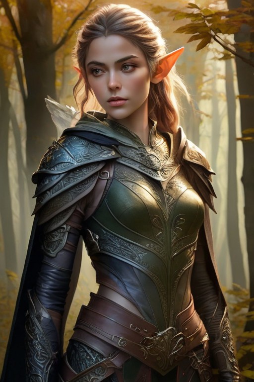 RAW photo, (masterpiece:1.3), subsurface scattering, heavy shadow, (high quality:1.4), (intricate, high detail:1.2), professional photography, HDR, High Dynamic Range, realistic, ultra realistic, photorealistic, high resolution, film photography, ambient lighting, atmospheric effects, <lora:detail_slider_v4:2>, OverallDetail, 80sdarkfantasysd15b, a female elven ranger wearing intricate leather armor, cape,<lora:ElvenArmor1:0.7>, elar, auwo, in a clearing in a magical autumn woods, sunlight, godrays, <lora:AutumnWoods:1>, <lora:zoom_slider_v1:1>, epiCPhoto <