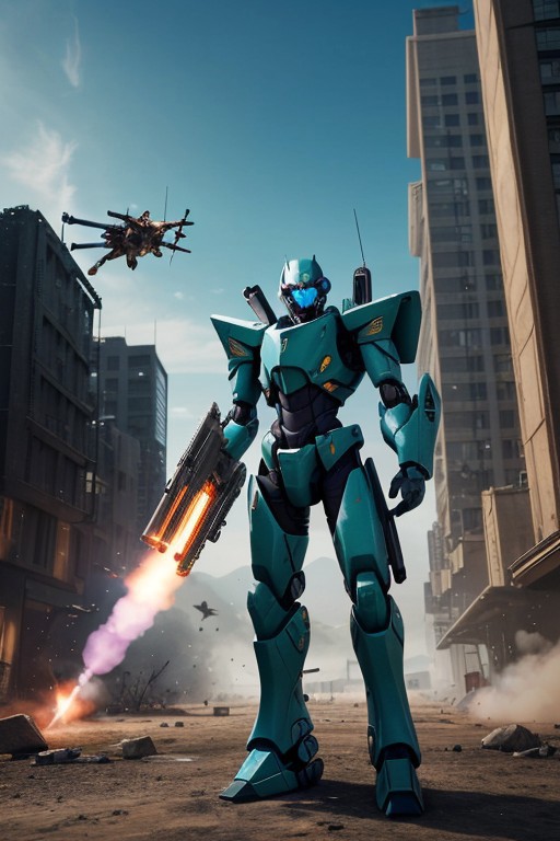 teal colour mecha armor, (flying toward the viewer:1.20), armaments equipped in the armor, (right hand holding beam rifle:1.20), destroyed city in the background:0.8, (beam rifle equipment on right hand:1.3), (shield equipment on left hand:1.3), mounted missile pod on shoulder