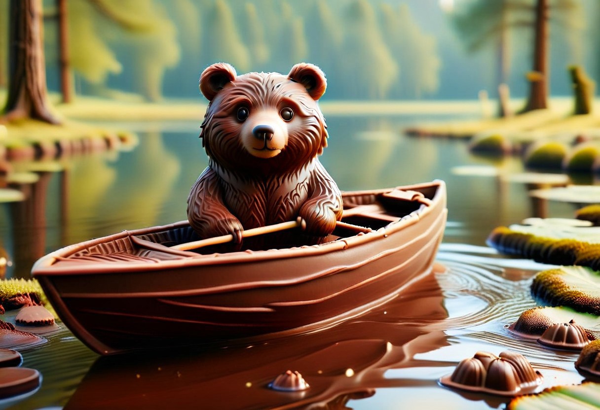 Row boat Made of chocolate, Pond and forest background, cute bear, photography, high quality, detailed, realistic