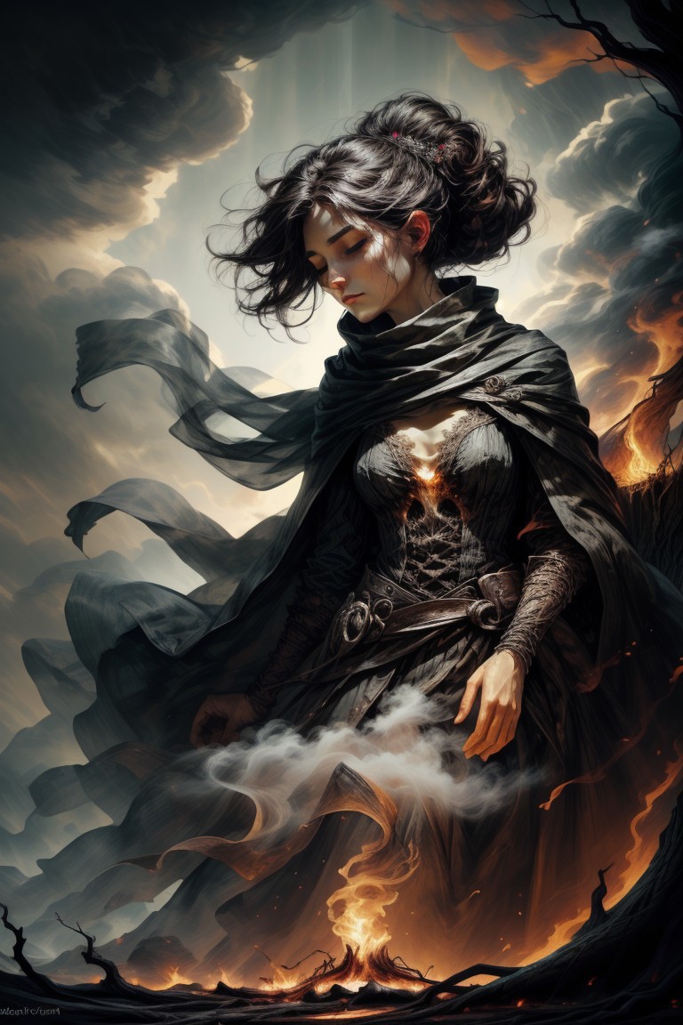 score_9, score_8_up, 8, score_7_up, solo, fantasy style, masterpiece, 8k, dynamic pose, 20 y.o, <lora:Fantasy_Classes_SD:1>, A high-contrast black-and-white portrait of a woman standing alone in the middle of a vast, drought-stricken landscape, where deep fractures carve across the dry lake bed. Her form is still, ethereal, as the lower half of her body is consumed by blackened roots, anchoring her into the cracked earth. Jagged, burnt tree limbs extend from her arms, their charred edges still crumbling away in the breeze. Above, a single harsh beam of light pierces through the thick smoke-filled sky, illuminating her pale face, catching the sharp curve of her cheekbones. Her head tilts back slightly, eyes closed. Her black beehive hairdo transforms into thick billowing black smoke that rises into the sky. The world around her is heavy with the weight of death and silence, yet her presence remains unbroken—an unburned figure in a world turned to ash. The last remnants of the fire, glow deeply within the cracks of her rooted body, as if embers still breathe beneath the surface and provides the only color in the image along with the fire burning in the distance. The contrast between the deep shadows, fractured land, and the delicate smoke drifting from her form creates an eerie, apocalyptic beauty. BREAK oil painting, BadDream, negative_hand, NEG_EMBED_STABLE_YOGI_V3, FastNegativeV2, AissistV2 (detailed:1.3), (sharp focus:1.1), medieval style, (expressive face:1.2),,