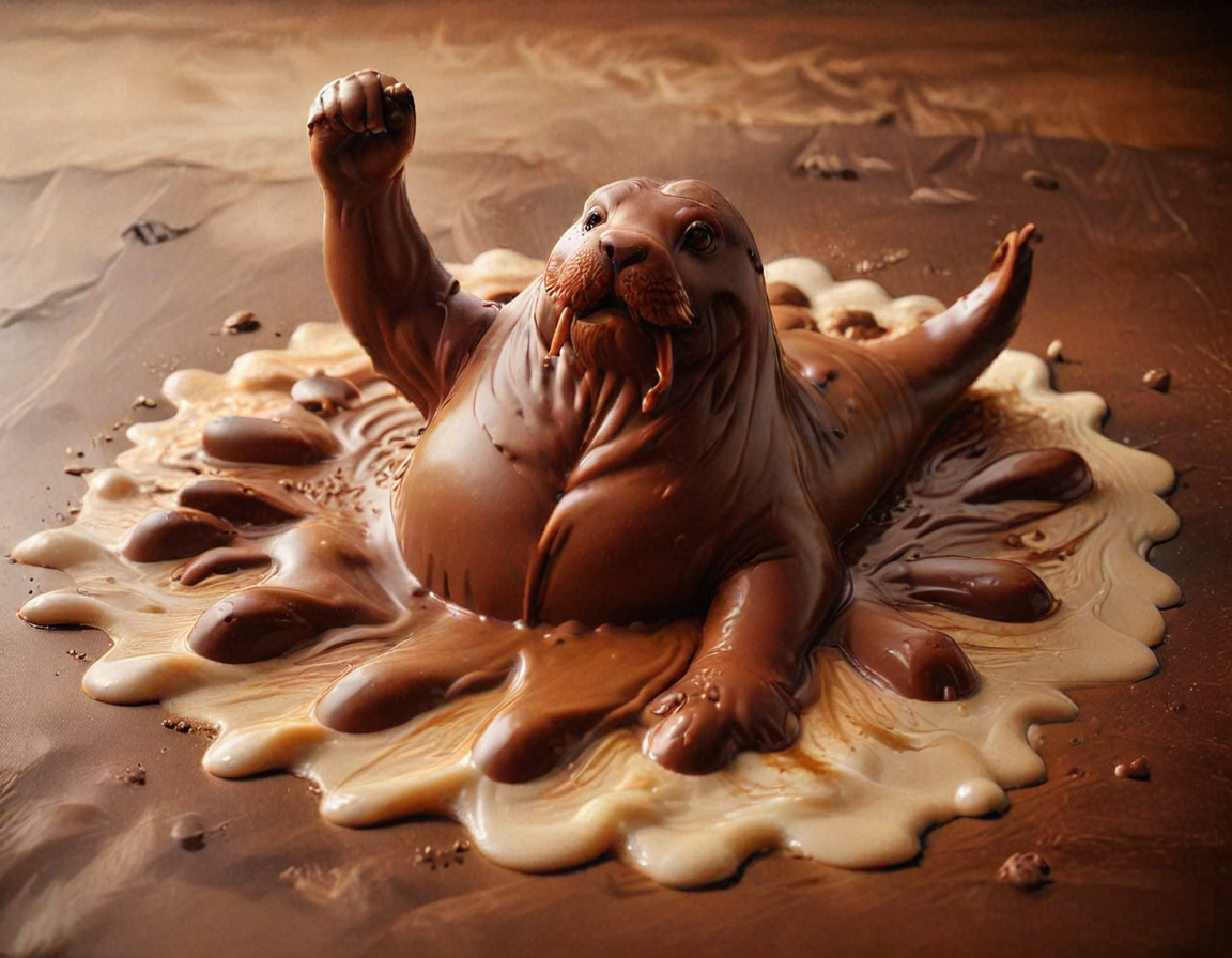 made of chocolate, Walrus belly-flops into a caramel river, splashing whipped cream everywhere, Sunset over a peaceful countryside, from above/high angle