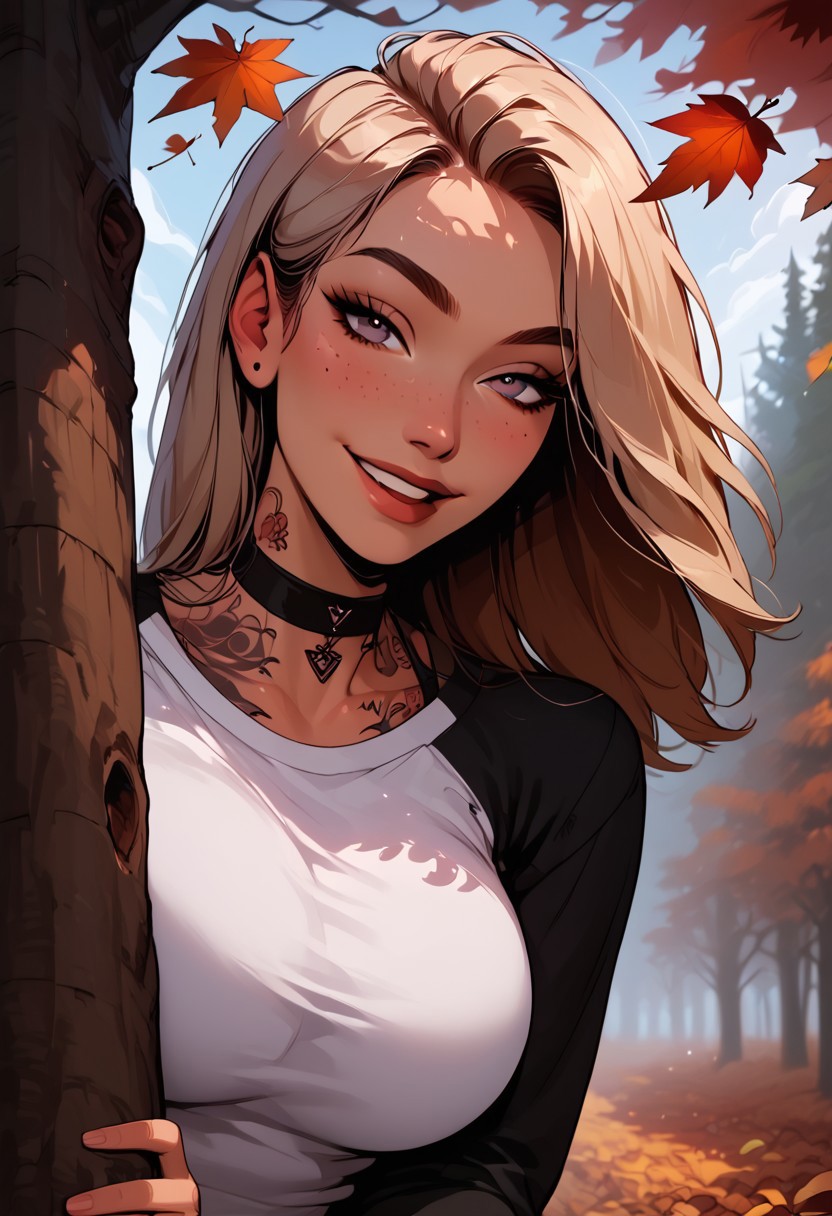 Score_9, Score8_up, Score_7_up, (((High Resolution, Best Quality))), 1girl, solo, toned arms, Covered in Tattoos, neck tattoos, white shirt, long black sleeves, tight shirt, large breasts, choker, seducing, seductive, flirty, tender, loving, playful, looking at viewer, playful body language, smile, confident, (peeking out, hiding behind tree, large tree), Outside, woods, autumn, leaves blowing in the wind, leaves falling, Cloudy Sky, cowboy shot,