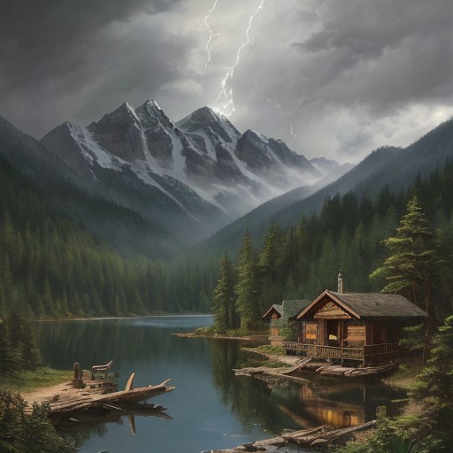Masterpiece, high-resolution, oil painting, tall mountains, pine forest, log cabin, lake, large thunderstorm clouds in the distance