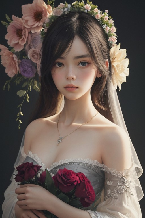 A breathtaking, exquisitely detailed RAW color photograph, capturing a masterpiece of realism with fine grain and crisp clarity. The image presents a stunning and captivating scene with brilliant lighting and a magnificent composition that adheres to the rule of thirds. Showcasing award-winning quality and incredibly realistic detail, the Rembrandt lighting adds depth and contrast, while the dynamic, film-style composition evokes the elegance of a world-famous painting. The final result is a lustrous, high-resolution image with rich detail and delicate, exquisite grain, making it ideal for wallpaper art or product shots. The centered composition emphasizes the subject, creating a strong, magnificent visual that serves as the perfect backdrop. A high-end gray background, a close-up of the beauty's upper body, a beautiful neck and collarbone, and her entire face is covered by blooming flowers of various colors. The focus of the picture is the strange combination of these flowers and people, beauty and horror, surrealism, master photography,