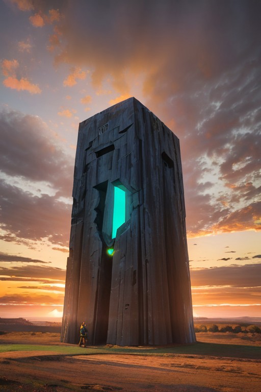 extremely detailed forest, dark forest, (red sunset:1.3), (futuristic monolith:1.8), the monolith is (made out:1.1) of greem emerald of an alien type, The glass has sharp, with a subtle internal green glow, emerald gemstone, futuristic landscape, cloudy weather, dark, unreal engine 5, perfect composition, vibrant, rtx, hbao, extremely detailed, maximum resolution, 8k, (perfect composition:1.2), superior color grading, (realistic:1.4), (panoramic composition:1.5), (complementary colors:1.9)