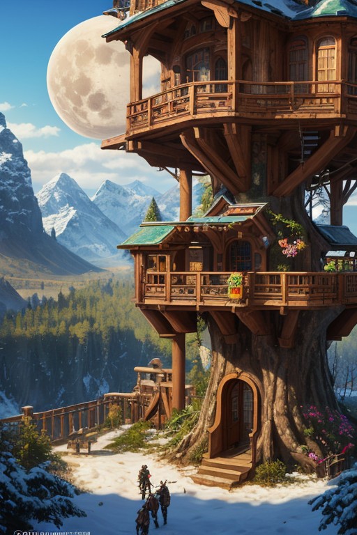 (masterpiece:1.5), score 9, score 8 up, score 7 up, masterpiece_portrait, extreme quality, reflection, surface reflection, dynamic lighting, Cinematic style, cinematic quality, ((no humans, no people)), photorealistic, realistic, a spectrum of iridescent colors, precise, fractal design, flowing curves, precision, colorful, fractal geometry, harmonic interference, digital illustration, photo manipulation, altered realities, fantastical scenes, digital artistry, striking visuals, sharp focus, detailed background, light reflection, A huge open valley with large snow-capped mountains in the background, in the center of the valley is (enormous steampunk treehouse), the (enormous steampunk treehouse) has been here for a very long time, strange foliage has started to grow over it, when this (enormous steampunk treehouse) was built no one knows it has long been forgotten, beautiful blue skies majestic clouds, trees dot the landscape, in the sky you can see a large moons is all inspiring and a little frightening, the valley is also covered in beautiful steampunk flowers and steampunk trees, no life can be seen anywhere, 3D, metallic reflection, enormous steampunk treehouse, sci-fi, fantasy,
