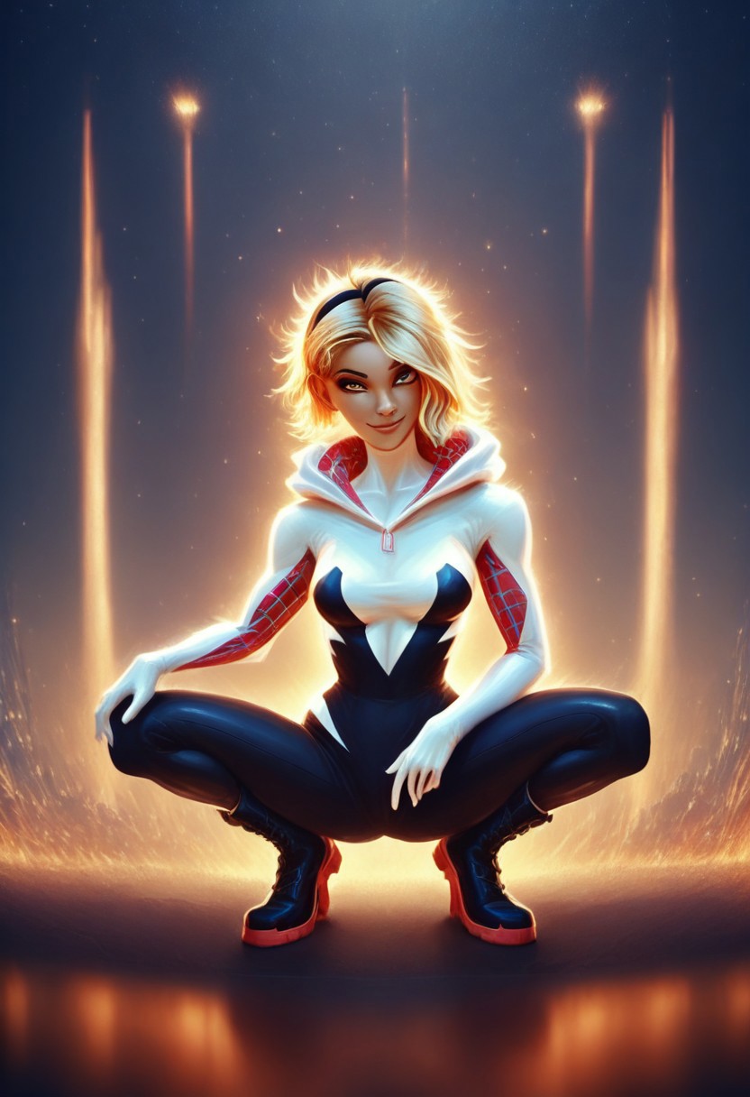 score_9, score_8_up, score_7_up, score_6_up, score_5_up, score_4_up, rating_safe, c4lyx, highly detailed, complex composition, Gwen Stacy, dynamic lighting, intricate textures, high-contrast lighting, whimsical and modern aesthetic, spider-gwen suit, bokeh, cityscape, neon lights, flexible anatomy, head tilt, light smile, 28 years old, red knee boots, cstatuesdxl, c4lyx, Jed-mrbl