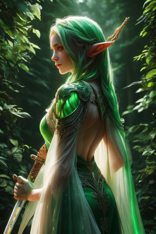 DonM3lv3s, Incredibly beautiful side photos of an elves wearing emerald green combat uniforms with dazzling swords scattered with gems, shining forests make the elves shine even more, incredible details, top quality, dramatic lighting,