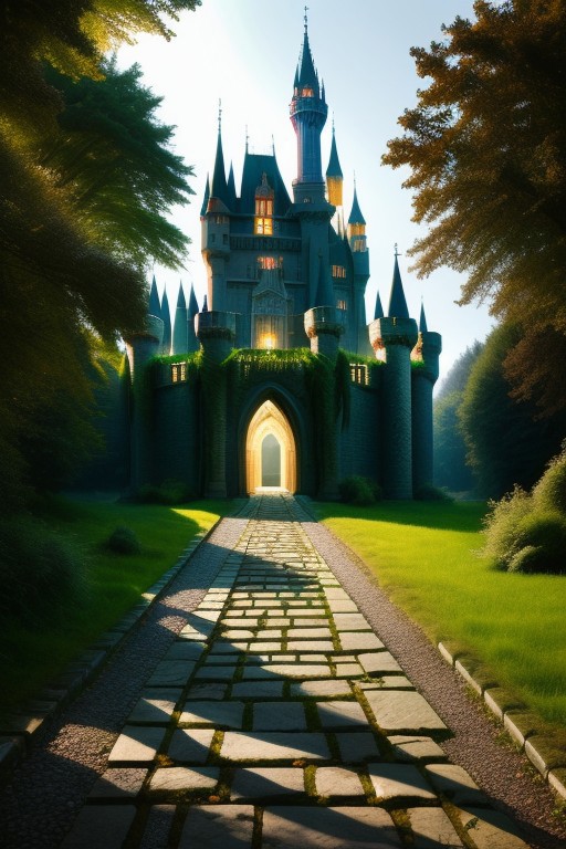 masterpiece, awesome quality, hyper detailed, soft lighting, high resolution, DonM3lv3s castle, forest, ruins, cobblestone pathway, fantasy, sfw