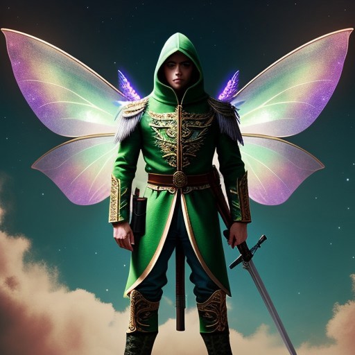 masterpiece, awesome quality, hyper detailed, DonM3lv3s, full body, a man with military suit and hood, holding rifle, flying, sky, fairy wings, pixie, purple highlight, sword on waist, <lora:DonM3lv3s-000008:0.8>