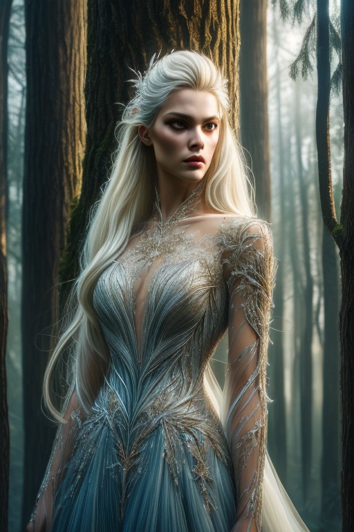 hyperrealistic art, DonM3lv3s, h0rr0rstyl3, long hair, 1girl, dress, white hair, tree, extremely high-resolution details, photographic, realism pushed to extreme, fine texture, incredibly lifelike