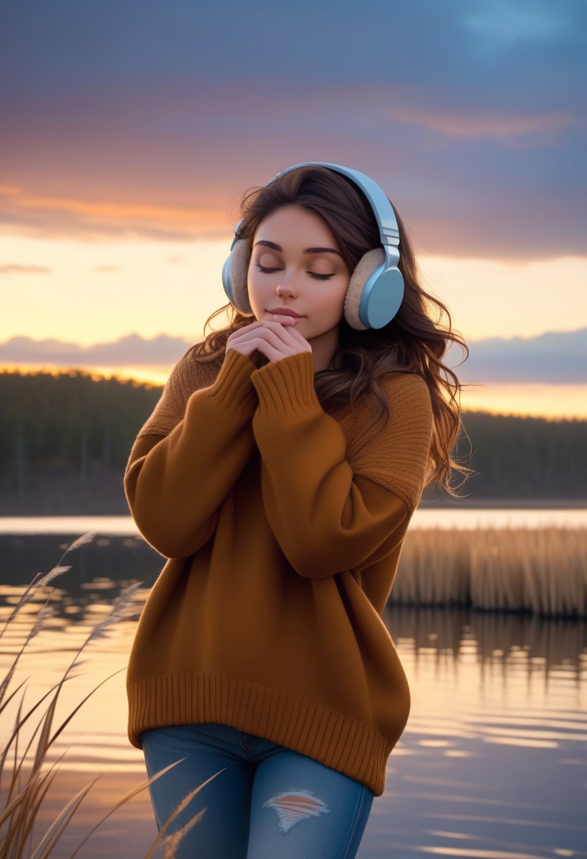 A young woman with delicate features and fair skin stands outdoors near a calm lakeshore at sunset, dressed in a cozy oversized brown sweater and blue ripped jeans. She wears fluffy beige earmuffs, gently pressing them against her face with both hands, eyes closed, and a serene, content expression. The golden light of the setting sun peeks through dramatic, overcast clouds, casting a soft, diffused glow over the scene. Tall, dried reeds frame the foreground, while the calm water reflects the cool tones of the sky. The atmosphere is peaceful and nostalgic, evoking warmth and tranquility despite the crisp air. The image is taken from a slightly low angle, capturing the woman in a relaxed pose with the horizon stretching behind her, adding depth to the composition. lidzia