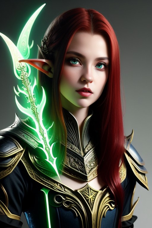 DnD style portrait, a BadDream female elf, pretty and young, skinny, has armor, and holds 2 daggers, wearing black, has a red hair and brown eyes <lora:DonM3lv3s-000008:1>