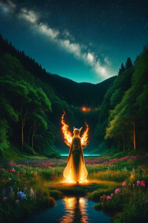 Lush forest, lots of flowers, night, lots of stars, elf girl, elves, fireflies, gauze, ethereal, lake, some small animals, UnrealisticDream, high quality