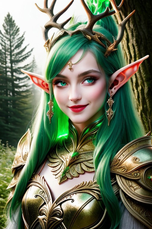 masterpiece, awesome quality, hyper detailed, DonM3lv3s female elf, long ears, very small antlers, war-craft, north American face, golden armour, druid, looking at viewer, blush, parted lips, kind smile, sfw, outside, evening, magical forest, trees, riven-dale, ancient ruins, dreamlike, green aura, glowing, fantasy, <lora:DonM3lv3s-000008:0.8>