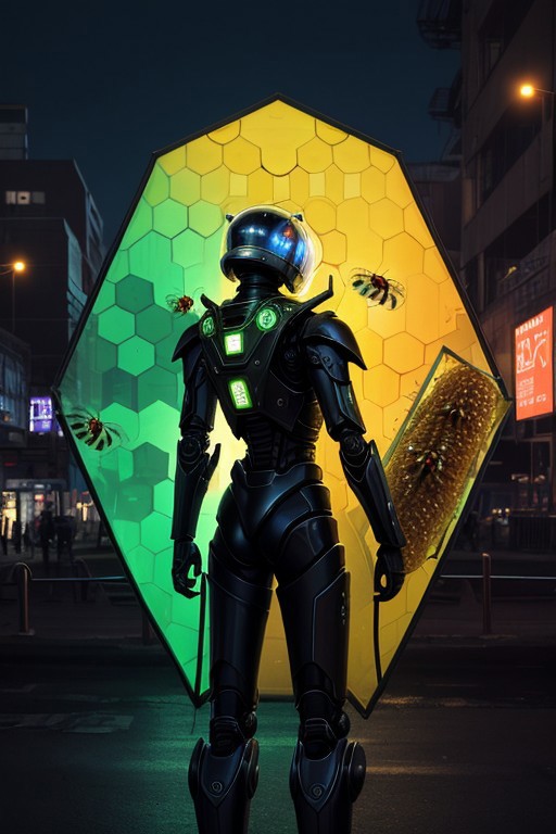 honeytech, honey, scifi, 1girl, <lora:HoneyTech-20:0.7>, hive, (hexagon:1.2), huge Bee in background, staple, (transparency:1.2), backlighting, swarm of bees, , elegant, scfi, diamond shield, night city, ,masterpiece, <lora:nijiarmor:.6> ,black robot,dark theme,green light,,hard light,geometrical pattern,complexity,rush,twisting,,geometry, slender