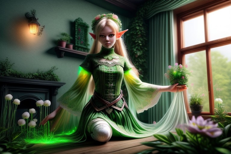 `masterpiece, best quality, highly detailed, ultra detailed, DonM3lv3s, (photorealism:1.2),embedding:lazympos hyper detailed masterpiece, dynamic, awesome quality, DonM3lv3sXL, 1girl, (elf),, kawaii, wide sleeves, high neck, delicate patterns, colorful flowres, glow, indoors, plants, nature,