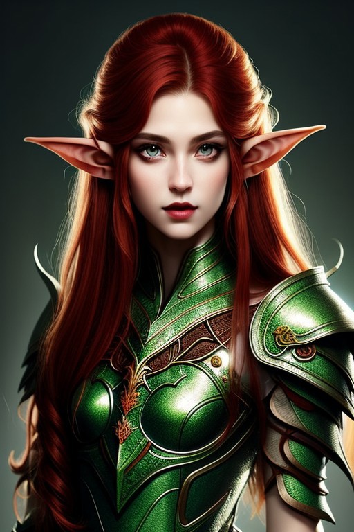 DnD style portrait, a BadDream female elf, pretty and young, skinny, has armor, and holds 2 daggers, wearing black, has a red hair and brown eyes <lora:DonM3lv3s-000008:1>