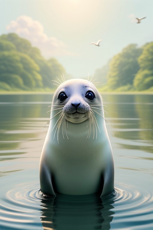 score_9, score_8_up, score_7_up,A cute little smiling seal, standing on its hind legs in the water, and an adorable white seagull sitting atop its head. This illustration is created using digital painting techniques against a clean background. It captures intricate details of fur texture, feathers, expressions, and natural lighting, showcasing high resolution. The overall composition exudes warmth and cuteness, making you want to hug them so hard! in the style of Ryo Takemasa