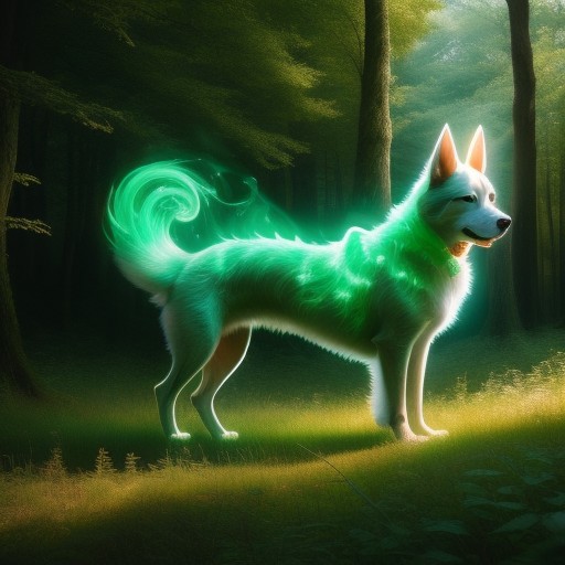 a dog in DonM3lv3s style in a forest, green, glow, forest