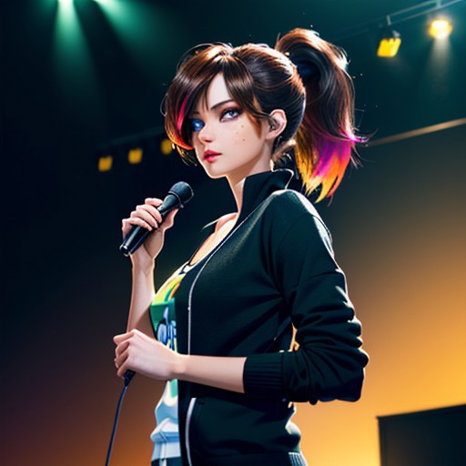 (masterpiece, best quality, ultra-detailed, best shadow), masterpiece, need_buzz, holding sign, anime, 1girl, red hair, smug, gradient background (detailed background, cowboy shot, backlighting, playing electric guitar and singing into a microphone, on stage, standing, guitar, looking forward, serious expression, bright stage lighting), (beautiful detailed face), high contrast, (best illumination), ((cinematic light)), colorful, hyper detail, dramatic light, intricate details, (gardevoir,creatures \(company\), game freak, nintendo, pokemon, pokemon \(game\), bangs, colored skin, female focus, gen 3 pokemon, black hair, (messy ponytail), black cardigan, tshirt, sweatpants, hair over one eye, multicolored skin, pokemon \(creature\), blue eyes, white skin), <lora:gardevoir_V2:0.8>, <lora:anime_guitarv1:0.6>