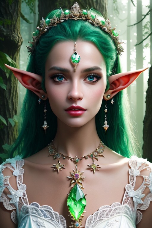 1girl, portrait, DonM3lv3s, elf, pointy ears, priestess, fantasy, glistening skin, crystal, jewellery, necklace, flower, eyelashes, collarbone, beautiful, detailed eyes, shiny lips, looking at viewer, forest (masterpiece, high quality:1.2), none <lora:NonHentaiElf_v10:0.9>