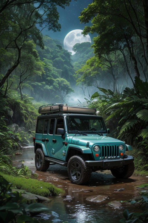 RAW photo, carribean island, delicate jungle grove, wild nature, picturesque scenery, enchanting moonrays, beautiful sky, majestic landscape, pristine vegetation, desolate atmosphere, morning island glade, blue water, jungle lake, photorealistic, masterpiece, 64k, UHD, ultra detailed, vivid colors, high quality, sharp focus, night, a moon, fog, rain, closeup toy jeep a car,
